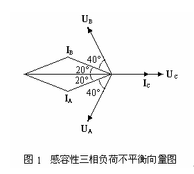 为了验证IN的值,测得各相负荷的相位|ΦA|=|ΦB|=40°,ΦC=0°,则ZA和ZB中必有一相为感性,一相为容性。设ZA 为感性, ZB为容性,向量图如图1所示。