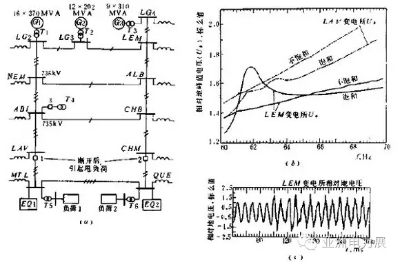 2)谐波谐振过电压。也是主要存在于小机带长线情况(令人烦恼的工况),由于这样结构方式的自然谐振频率较低,个别甚至低于工频,有可能因变压器的磁饱和或串补电容产生的谐波与之发生谐振。